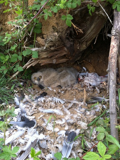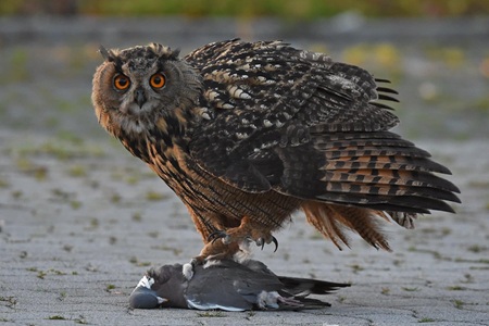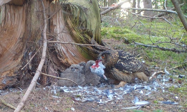 Een favoriete prooi van de Oehoe is de duif, en dan vooral de Houtduif. Niet omdat een Oehoe zo kieskeurig is, maar puur om het feit dat er meer houtduiven zijn dan andere duiven. Getrainde postduiven schommelen zo rond de 500 gram. Houtduiven zijn iets groter en minder gespierd maar zitten rond hetzelfde gewicht. Veren wegen niet zo zwaar dus het 'netto vleesgewicht' zal niet veel minder dan een pond zijn. Dit maakt het een ideale prooi. In het voor- en najaar trekken houtduiven massaal over het oosten van het land en dan vooral door Duitsland. Vooral in het najaar trekken er tienduizenden houtduiven langs deze route. In deze tijd zie ik dan ook grote groepen houtduiven in Duitsland. Groepen van enkele honderden vogels is dan geen zeldzaamheid. Aan het eind van de winter heeft de (Hout)duif nog een andere belangrijke functie voor de Oehoe. In deze tijd wordt het broedterritorium afgebakend en dit doen oehoes met visuele markeringen. Gevangen houtduiven worden naar de broedlocatie gebracht en zorgvuldig geplukt. De geplukte veren worden zodanig gepositioneerd dat het wel een prieelvogel lijkt. Soms wordt een duif versleept en op meerdere plekken op de groeverand geplukt. Gelukkig hebben ook duiven twaalf staartveren dus het aantal geplukte duiven is goed te tellen. Deze plukplaatsen worden zorgvuldig onderhouden en regelmatig voorzien van een nieuwe decoratie van duivenveren. Omdat het optische markeringen zijn moeten de veren wel opvallen. Daarom worden uitsluitend vogels met een opvallend verenkleed naar de broedlocatie gebracht. Soorten als Kerkuil, Ransuil, Gaai en Buizerd worden regelmatig gebruikt als territoriummarkering, maar duiven zijn toch veruit favoriet. Natuurlijk omdat er nu eenmaal meer duiven voorhanden zijn, maar de vele lichte veren vallen ook bijzonder goed op. En dat is toch het doel. Houtduiven die puur als prooi worden aangesleept worden doorgaans zonder vleugels aangeleverd. De broedende vrouw of het kroost krijgt dan een hapklare duivenbout. Vaak moeten ze zelfs genoegen nemen met alleen een stuit met staartveren. Het aantal duiven dat wordt aangevoerd als prooi is eigenlijk maar een klein deel van het hele menu. In de broedtijd zijn er natuurlijk ook minder duiven voorradig dan tijdens de trek in het voor- en najaar. Uiteraard zijn er uitzonderingen, maar de meeste oehoes die ik volg met camera's slepen maar zo'n 10% vogels aan. Hiervan is nog geen 10% duif. Prooien als ratten, muizen, hazen, konijnen vormen het leeuwendeel van het menu. Het nadeel is dat deze prooien in het geheel worden opgevreten en je hier dus weinig tot niets van terugvindt. Prooilijsten die zonder camera's tot stand zijn gekomen geven dus vaak een vertekend beeld van het daadwerkelijke menu.