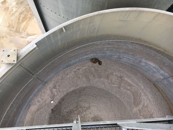 De jongen worden altijd groot, maar zodra ze hun eerste sprong maken om uit te vliegen, belanden ze vaak in een open silo vol zand (zie foto).